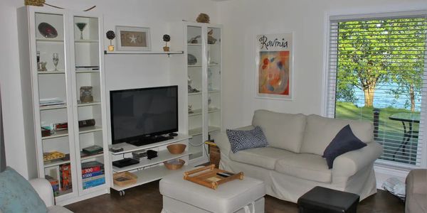 Our house is on a dead-end road and we only have 1 neighbour; the lots across the street and on the west side are undeveloped. This means that we're surrounded by nature with beautiful views out the front and back windows. We have 90' of sandy beachfront next to an even larger beach attached to an undeveloped property. Sunrises in the morning and moonlight at night over the lake are spectacular!